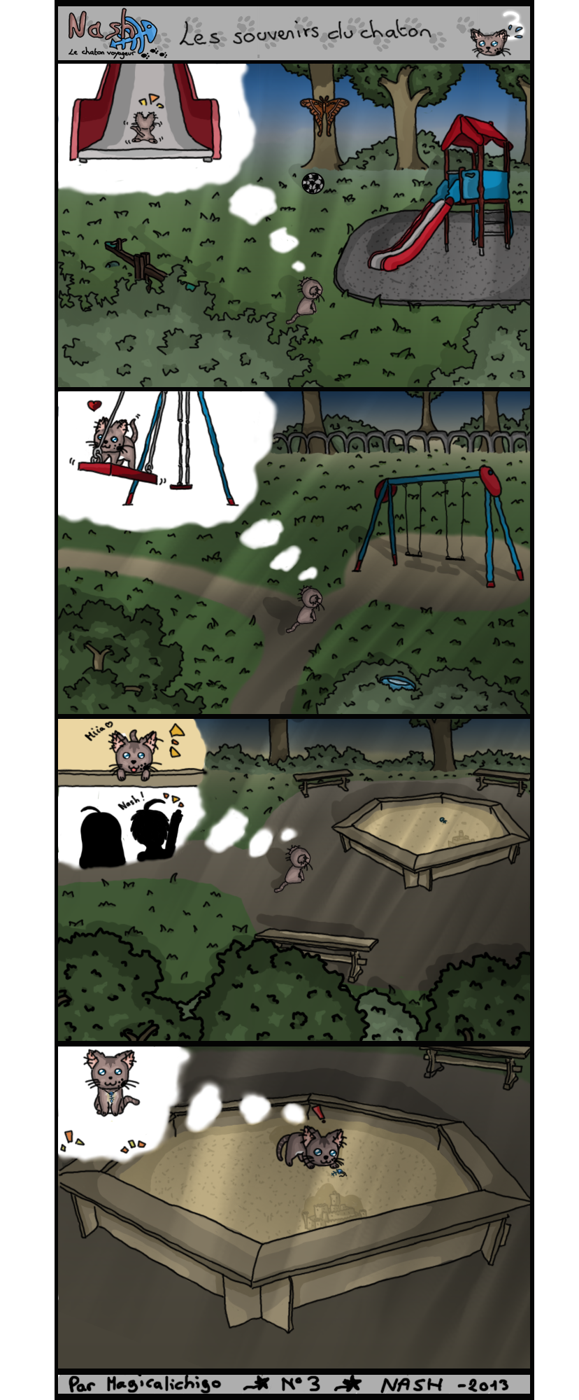 Alors que Nash se promène dans le parc, les souvenirs de nombreuses heures de jeu lui reviennent en mémoire, la balançoire, le toboggan, le bac à sable quand ses maîtres le rappelait pour rentrer. C’est dans celui-ci qu’il tombe sur son médaillon, cadeau de ses maîtres, égaré au début des vacances.