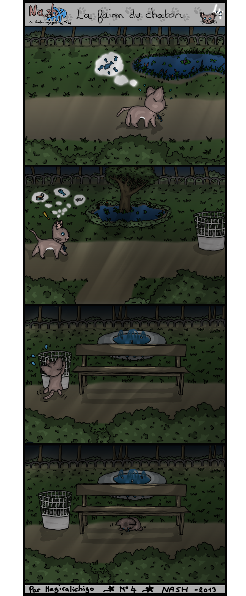 Toujours dans le parc, notre chaton se mets en quête de nourriture, affamé en pensant aux nombreux poissons de la marre. Il aperçoit alors une poubelle, et s’imagine déjà les trésors qu’elle recèle. Hélas trop petit pour atteindre son contenu, il se couche sous le banc, affamé et tremblant de peur.