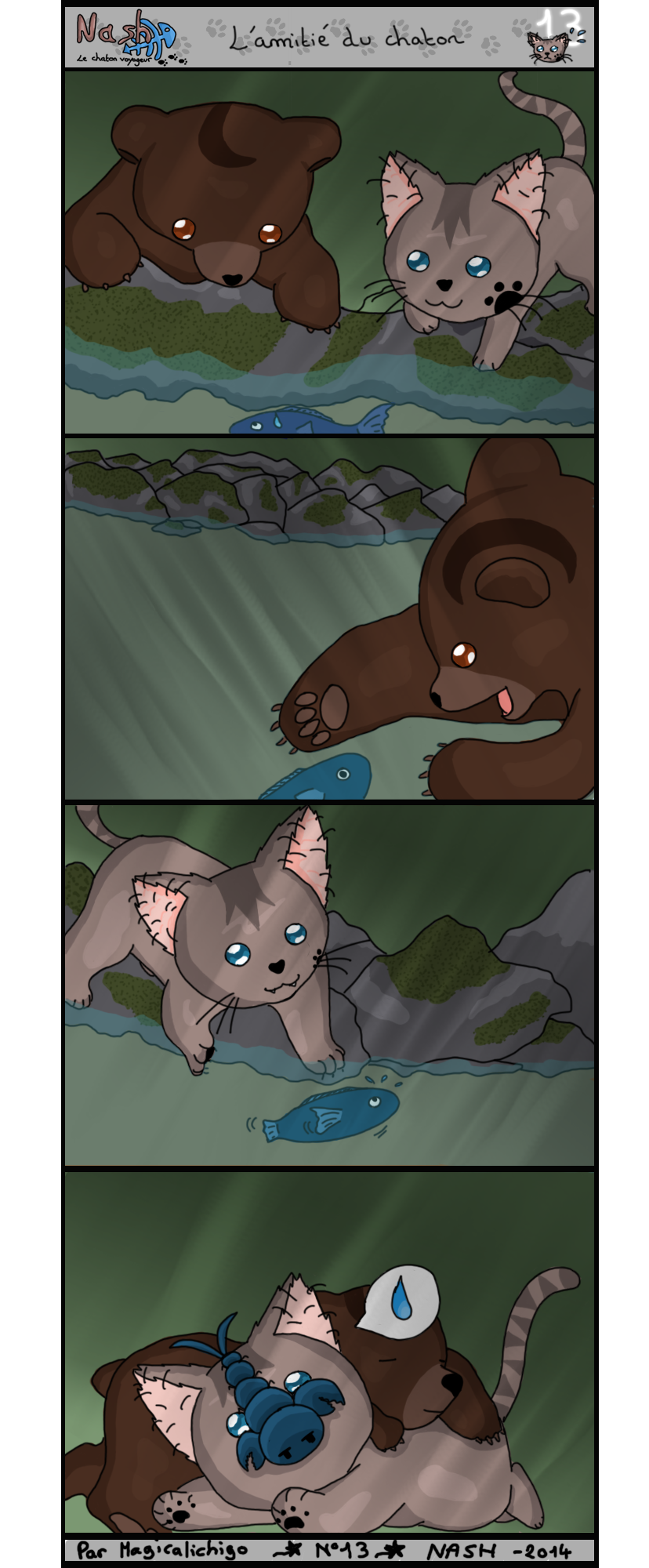 Nash et l’ourson, désormais bons copains, décident de partir pêcher ensemble. Après une après midi mouvementée au bord de la rivière, l’ourson s’effondre de fatigue sur notre chaton. Pimouss quand à lui tente d’attirer l’attention de Nash, le voyage doit continuer !