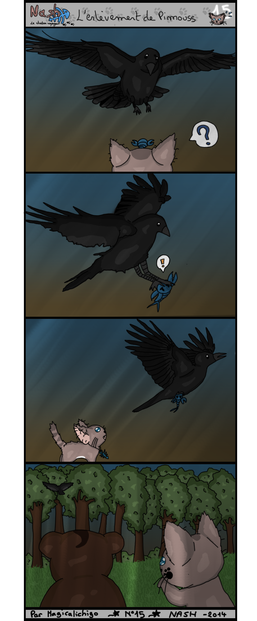Alors que Pimouss et Nash s’apprêtent à chercher un endroit pour passer la nuit dehors, un énorme corbeau descends du ciel dans leur direction. Avec une grande rapidité, le volatile emporte notre pauvre écrevisse dans les cieux, sous le regard médusé du chaton et de l’ourson. Que va faire Nash ? Que va devenir Pimouss ?