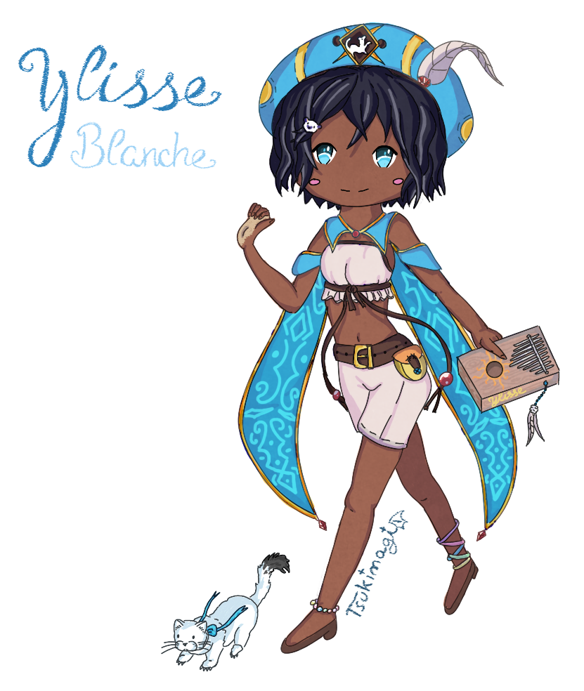 Un personnage d’une campagne de JDR auquelle je participais en 2020 avec des amis~ Ylisse est une jeune barde joueuse de Kalimba qui voyage accompagnée de Blanche, son hermine °w°