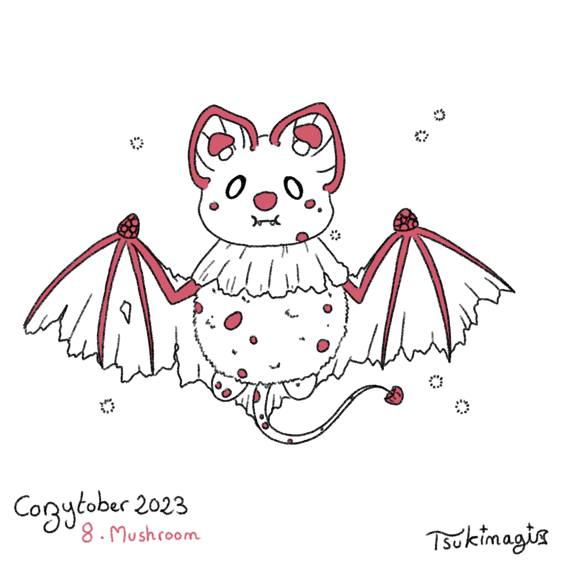 J’aime énormément les champignons, c’est donc avec un immense plaisir que j’ai imaginé le petit Mushy 🍄C’est une chauve-souris qui est en symbiose avec plusieurs espèces de champignons, ce qui lui permet de survivre dans un type de forêt particulier ! 🌳