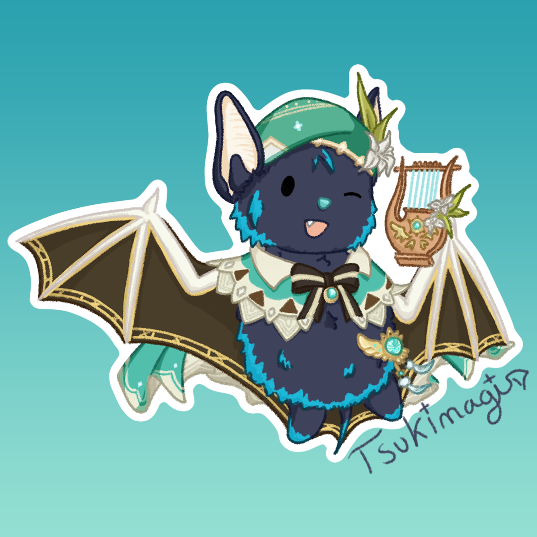 Pour Venti, c’est la Pipistrelle de Nathusius qui lui donne sa morphologie, car c’est une espèce européenne migratrice (la création de Mondstadt ayant été inspirée par l’Alemagne, j’essaie de prendre des espèces qui résident dans les pays qui ont inspiré les zones de jeux) et qui rappelle l’élément anémo du personnage ainsi que le fait qu’il se déplace lui même beaucoup ! 🍃