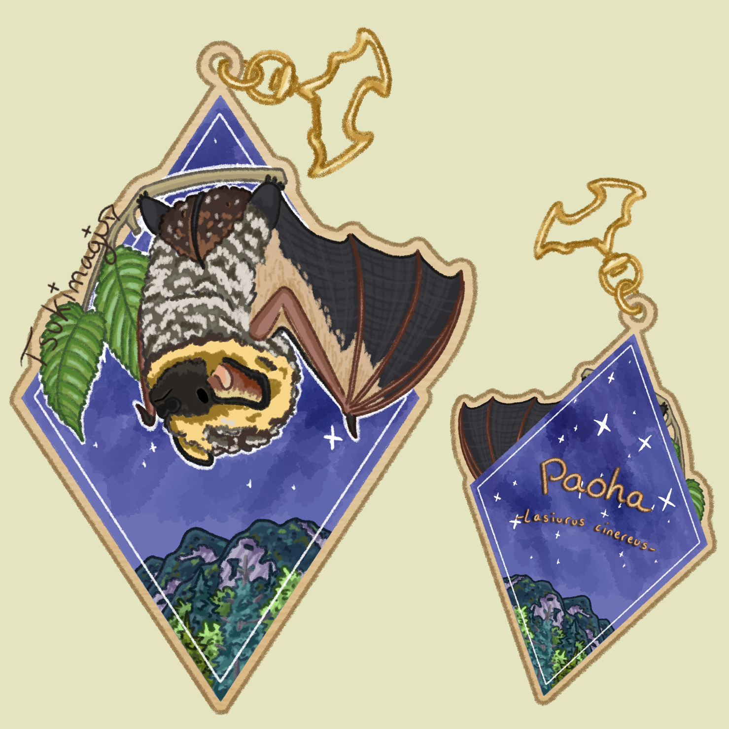 Cette fois-ci je vous propose de découvrir la Chauve-souris cendrée ou Lasiurus cinereus ! Elle compte actuellement 3 sous-espèces : Lasiurus c. cinereus que j’ai représentée ici et qui se retrouve donc sur la partie nord-américaine, Lasiurus c. villosissimus pour le continent sud-américain et Lasiurus c. semotus pour Hawaii (il y a cependant actuellement des discussions pour peut-être en faire des espèces à part entière !).