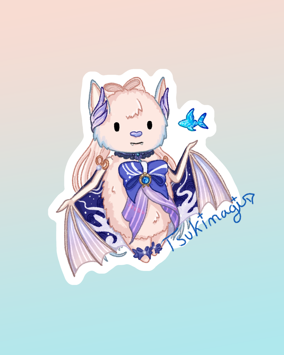 Kokomi a été l’une des chauves-souris les plus faciles pour moi à dessiner car j’ai très vite visualisé les éléments à garder comme son gros flot, la déco sur la tête, les petits nœuds partout… Pour les ailes c’était aussi très chouette d’incruster les motifs de sa tenue et de garder l’aspect transparent/aérien ! ❤️