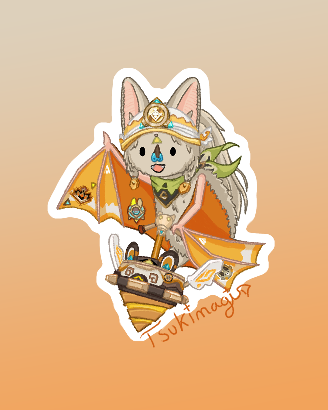 La région de Natlan a des influences assez diverses et variées, j’ai donc fait pas mal de recherches pour essayer de trouver les influences pour celles de la tribu de Kachina. Son prénom fait directement référence à des esprits du même nom dans la mythologie des « Hopis » et « Zuñis » qui résident dans le sud-ouest des Etats-Unis (Nouveau-Mexique, Arizona). Plusieurs personnages de la tribu portent des noms inspirés des Mayas, ce qui recoupe globalement la même zone. Enfin pour finir, la tribu est bien sûre fortement liée aux environnements rocheux. Toutes ces infos m’ont conduite à choisir la « California leaf-nosed bat », une espèce mexicaine qui se repose dans les grottes et anciens tunnels de mines. Elle est également douée pour la chasse proche du sol 🦇 J’ai aussi choisi cette espèce car elle a de grandes oreilles qui rappellent celles de Kachina !