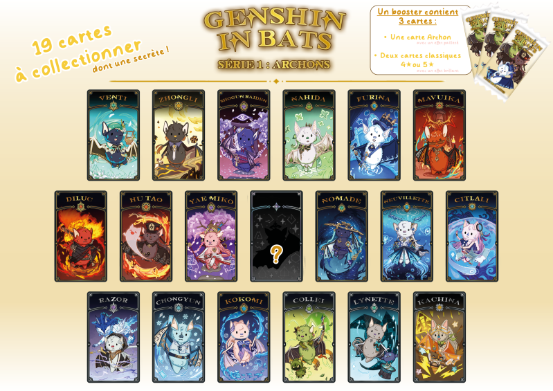 Étant une grande collectionneuse de cartes, j’avais très envie de réaliser mes propres boosters… Ils sont faits à la main et contiennent 3 cartes aléatoires : un Archon et 2 cartes classiques. J’ai préféré faire un petit booster pour que le prix ne soit pas trop élevé et qu’il soit plus simple d’obtenir tous les Archons si le cœur vous en dit ! ❤️