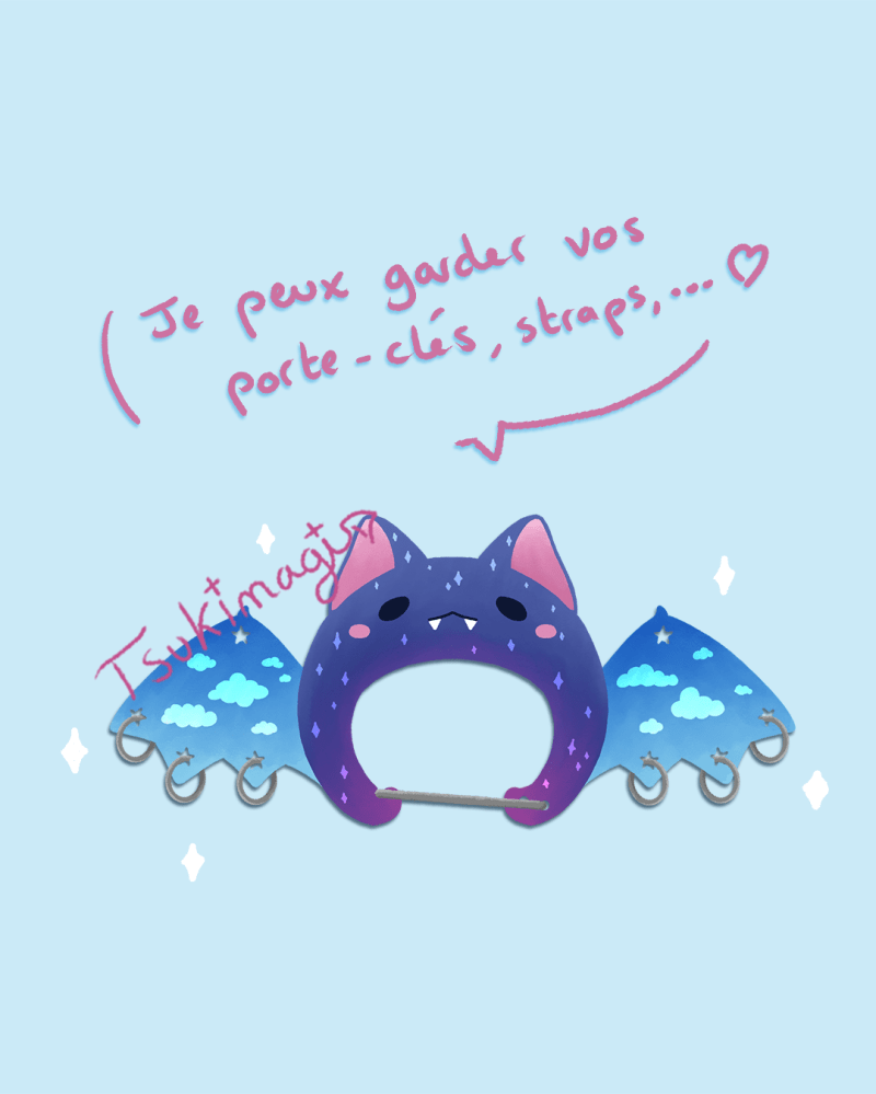 A l’envers les 2 petits trous étoilés au niveau des pouces lui permettent de tenir 2 straps, et 2 porte-clés sur le bout de ses ailes ! ❤️